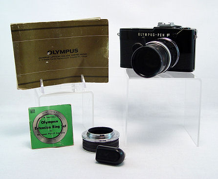 OLYMPUS PEN F 35 MM CAMERA WITH SLR LENSE AND EXTENSION RING SET: Sold with the case and original instruction booklets.