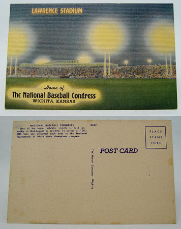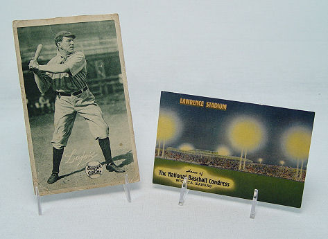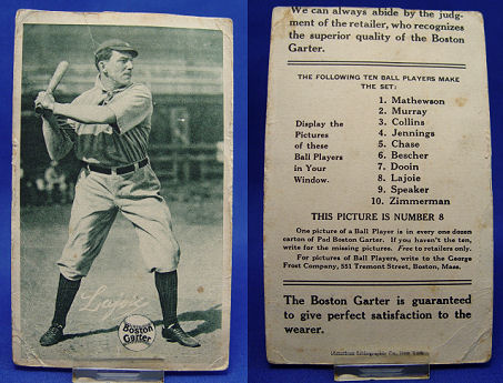 BOSTON GARTER ADVERTISING CARD OF NAPOLEON LAJOIE: 1914 baseball card measures 6 1/4'' x 3 5/8'', #8 in a series of 10 provided with every dozen Boston Garters ordered. Sold with a Lawerence Stadium Home of The National Baseball Congress Wichita, Kansas postcard.