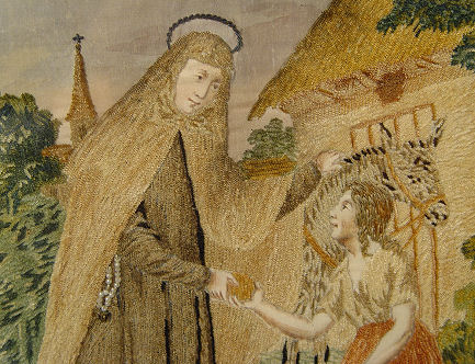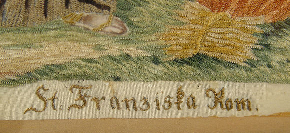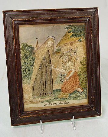 NEEDLEWORK DEPICTING ST. FRANCISTA: St. Francis and a young child. Note the bead work sewn in as the rosary. Silk on silk. Framed under glass. Cloth is 8 1/2'' x 7 1/4''. Framed overall 10 1/2'' x 12 1/2''.
