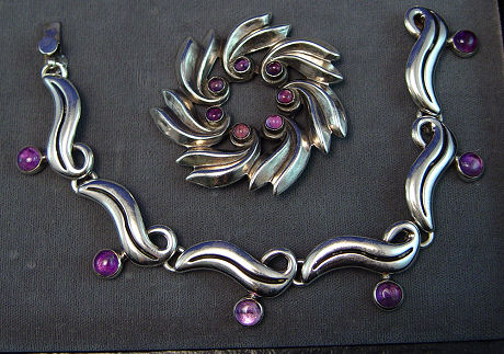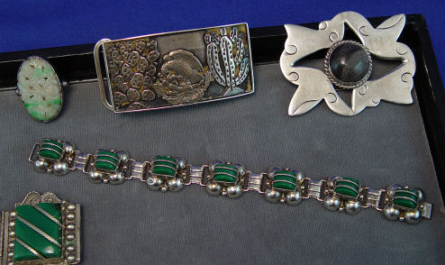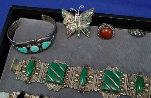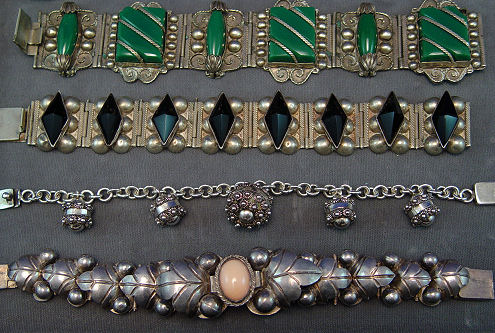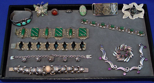 SPECTACULAR LOT OF ESTATE MEXICAN SILVER JEWELRY: Comprising heavy ornate belt buckle, leaf motif link bracelet with cabochon coral, black and green onyx silver reticulated bracelets, abalone butterfly Spratling style pins and bracelet. Some marked Taxco and Platalinda. Sold as a lot.
