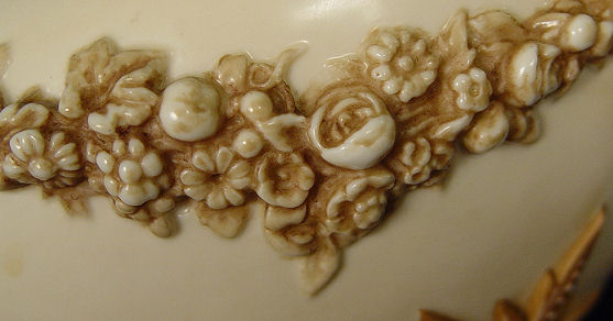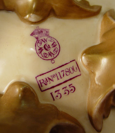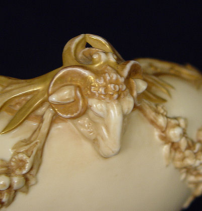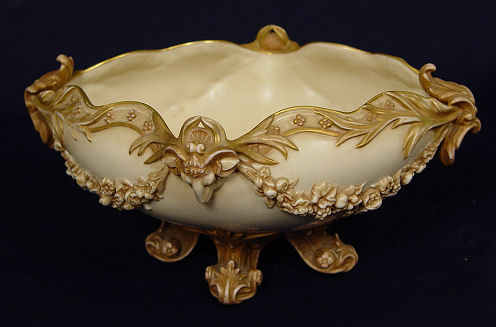 OUTSTANDING ROYAL WORCESTER CENTER BOWL CA. 1889: Highly detailed fruit and floral swag, each meeting at the four ram's heads. Scroll acanthus leaf feet. 5 1/2''h, 11''l.