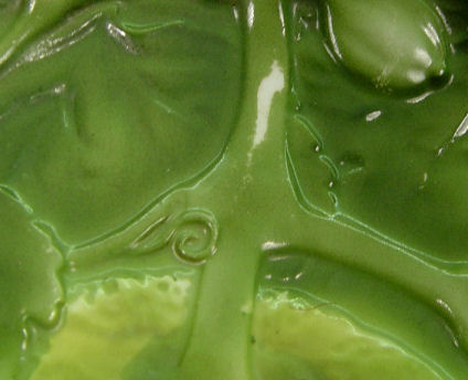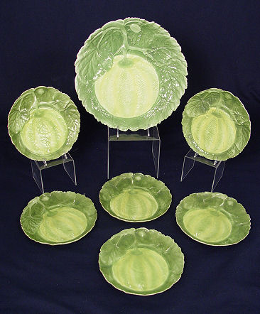 MAJOLICA GLAZE MELON SET: Embossed image of caneloupe. The set include large serving plate, 14'' dia, and 6 plates, 8 3/4'' dia.