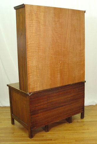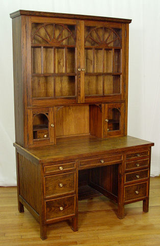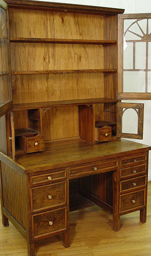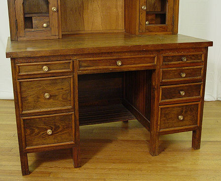19th C AMERICAN COUNTRY PINE SECRETARY BOOKCASE DESK: Said to have been a doctors desk. Upper section bookcase, lower section is a kneehole desk. Primary wood is pine. 75''h x 46'' x 26 3/4''. Old termite damage found to lower back.