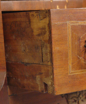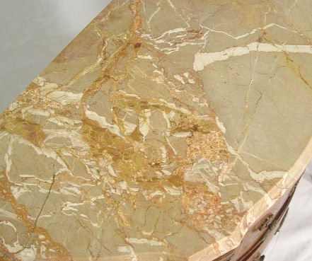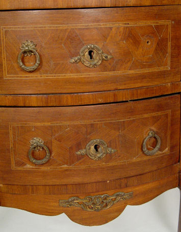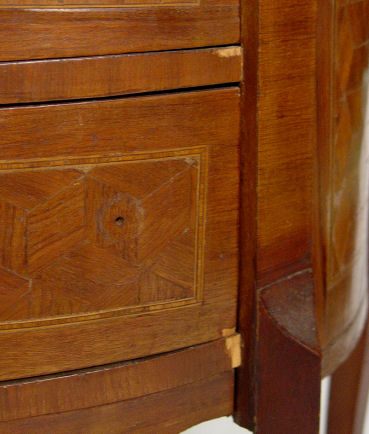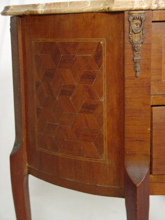 PAIR OF FRENCH PARQUETRY MARBLE TOP STANDS: Two drawer demi shaped stands topped with red marble. Parquetry work to the sides. 28 1/2'' x 27'' x13 1/2''. Please call for condition.