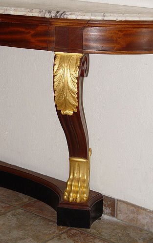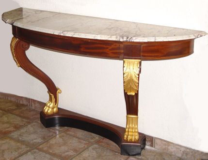 MAHOGANY CONSOLE MARBLE TOP TABLE IN DEMI-LUNE FORM: Beveled white marble top, frieze with one long center drawer, supported on 2 cabriole legs with gilded acanthus leaves at the knees, exaggerated gilded lion paw feet. All on conforming beveled mahogany base. Circa early 20th Century. 35 1/2'' h., 62 1/2''l.,21'' d.