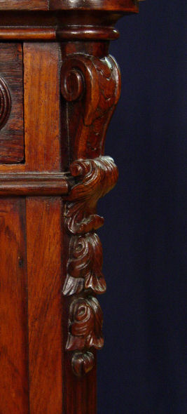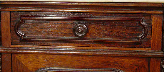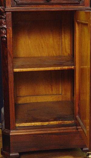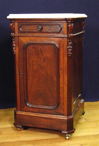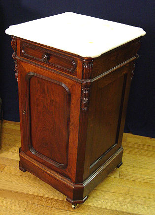 AMERICAN ROCOCO ROSEWOOD NIGHT STAND: Attributed to the New York firm of Alexander Roux. Satinwood lined and with it's original white marble top. Circa 1860. Please call for condition. 32''h x 18 1/2''w x 18 1/2''d.