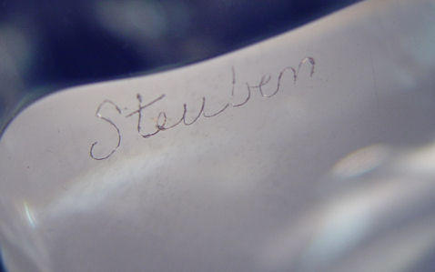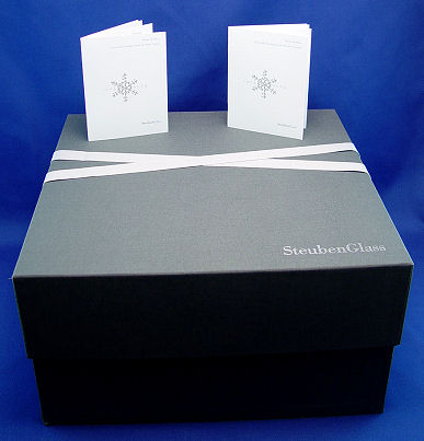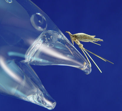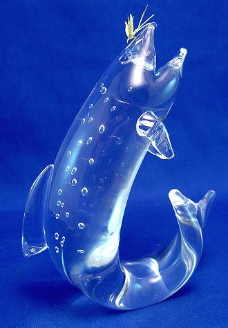 JAMES HOUSTON STEUBEN CRYSTAL TROUT WITH 18K GOLD FLY 8''H: The Steuben Crystal Trout arches upward toward a Royal Coachman fly of solid 18 karat gold. The trout's characteristic iridescence is reflected within the gleam of carefully placed bubbles, skillfully trapped beneath a second layer of glass as only James Houston, master designer at Steuben could create. Sold with gift box and wrapping from Steuben Glass. Currently available at Steuben, $3500.00. Glass measures approximately 8''h.
