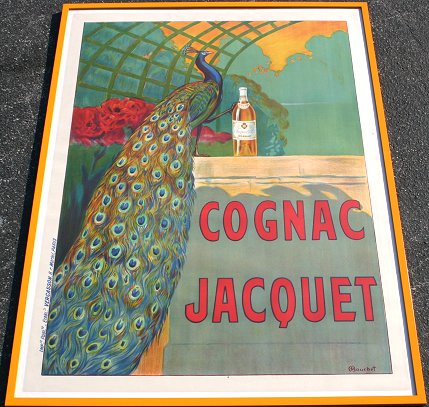 COGNAC JACQUET VINTAGE POSTER BY BOUCHET: 63'' x 47'' with full margins, encased in metalic matching frame with minor wear, 67'' x 51''. Condition - Good overall with minor creasing, probably laid.