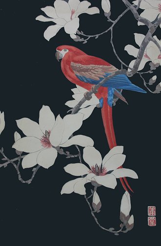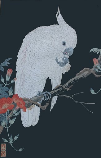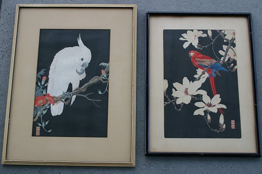 TWO HODO NISHIMURA WOODBLOCK PRINTS: (1) Parrot, sight size 14'' x 9 1/4'', worn black lacquer frame, measures 18 3/4'' x 14''. (2) White cockatoo, 14'' x 9'', worn white frame, 20 3/4'' x 16''. Sold as is.