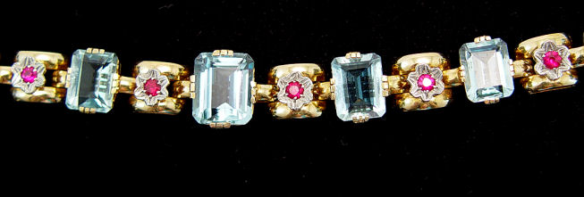 RETRO DECO AQUAMARINE & RUBY BRACELET: Natural aquamarines graduating in size from 8.3 x 7 x 3.5 up to 11.7 x 10 x 6.2mm and back again, approx. 30cts total, set in square baskets and separated by humped links topped by white gold star flowers centered by natural rubies, approx. 1ct total. Assays 18k, 7 1/2''l., 30.3 grams. Est. $2000/3000**