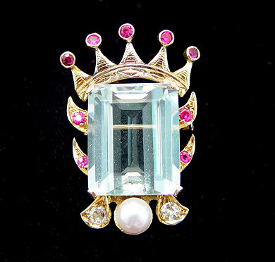 RETRO DECO AQUAMARINE & RUBY CROWN PIN: 18k yellow gold brooch centered by a large natural aquamarine in an emerald cut, measuring 14.7 x 18 x 9.5 approx. 15ct, above a 5.5mm pearl flanked by two period diamonds approx. 1/4ctw. Natural rubies on each side and across the top of the crown. Approx. 1 1/4'' x 3/4'', 9 grams. Est. $1000/2000**