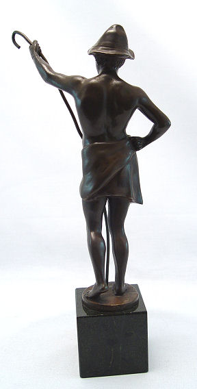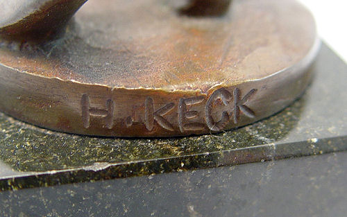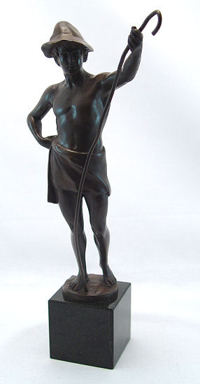 KECK, Hans, (European, 19th/20th C): Young shepard, Bronze, 9 1/2'' h., affixed to a polished stone plinth, incised signature to base. Condition - Mild wear to patina, barely visible repair to extended hand.