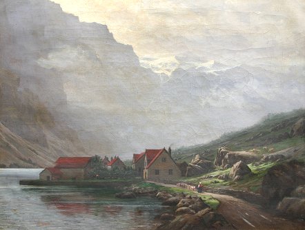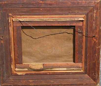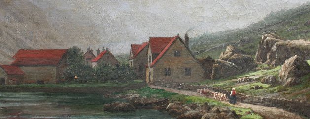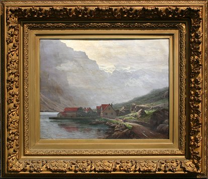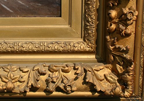 REYNOLDS, John P., (English, 19th C): Alpine lakeside village with shepherdess and sheep, O/C, 18 1/2'' x 23 3/4'', signed lower right and dated 1885, label affixed verso indicating artist and address which is ''Beach house, Latchford, North Warrington'', encased in superior elaborate carved and gesso frame with floral and foliate motif and high relief throughout, overpainted with some minor wear and missing gesso, very heavy, 32'' x 38''. Condition - Several areas of minor paint fleck, craquelure in the sky, needs cleaning, minor in-paint. Est. $2000/4000**