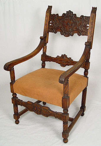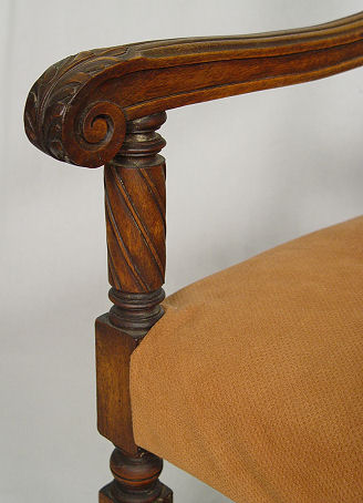 CARVED MAHOGANY THRONE CHAIR: Carved splat, acanthus leaf scrolled arms, spiral legs. Upholstered seat. 46 1/2'' x 25'' x 21''.