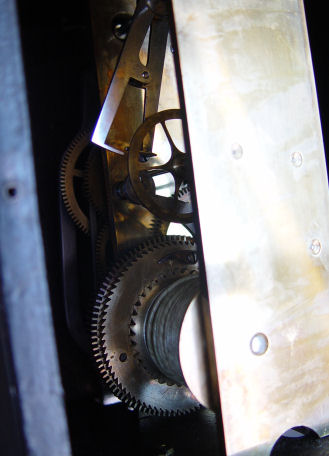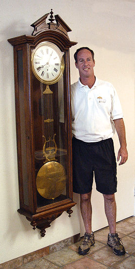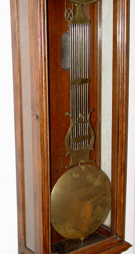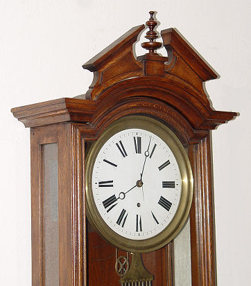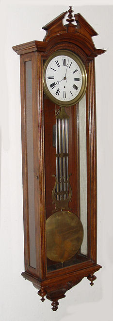 FABULOUS AMERICAN OAK REGULATOR CLOCK: Enameled dial with Roman numerals, a 12'' dia. pendulum, single weight driven movement in good working order. Renaissance Revival oak cabinet. 67''h. x 21'' x 10''. Est. $6000/8000**