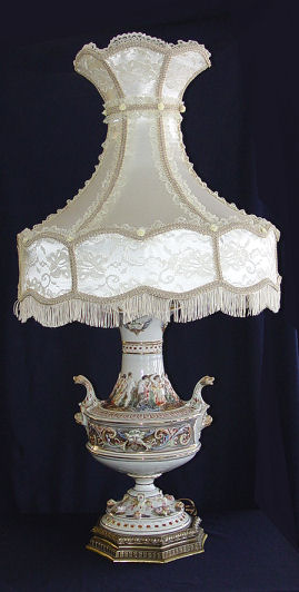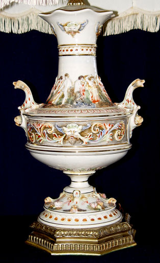 CAPO DI MONTE ITALIAN CERAMIC TABLE LAMP: Large Capo di Monte table lamp with dragon handles and raised figures, original silk shade with fringe. Measures 38'' h with shade, porcelain portion 23'' h. Undetectable professional restoration on one head.