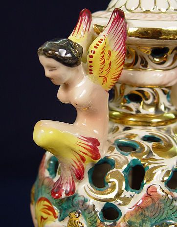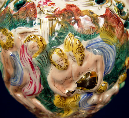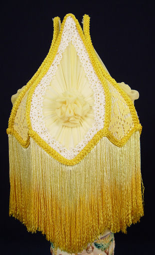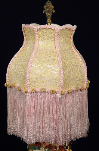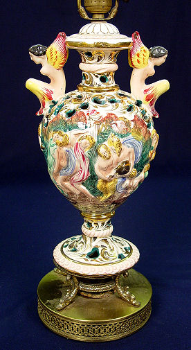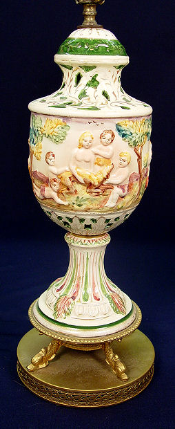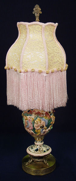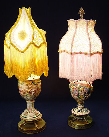 TWO CAPO-DI-MONTE TABLE LAMPS: 2 Capo di Monte table lamps with raised figural decoration. Lacy fringed shades, one pastel yellow, the other pink. The lamp with the yellow shade measures 29 1/2'' h with shade and 17'' h without. The lamp with the pink shade measures 29 1/2'' h with the shade and 16'' h without. and fringed shades. Unsigned.