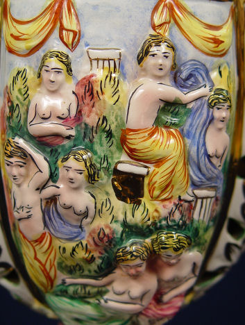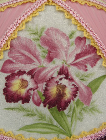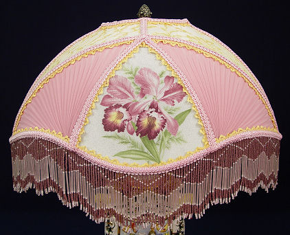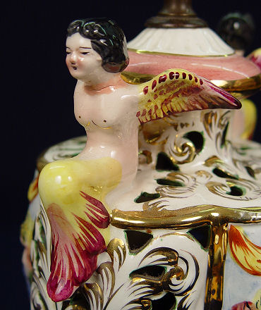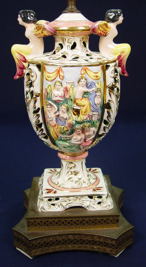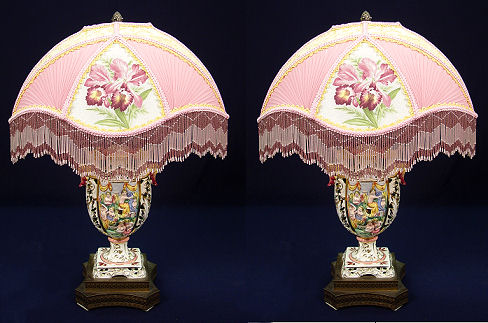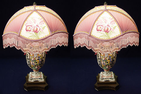 PAIR OF ANGEL CAPO-DI-MONTE TABLE LAMPS: Matched pair of Italian ceramic table lamps with shades of elaborate orchid motif panels and glass beaded fringe. Pair of angels sit at the top of each lamp. Measures 26 1/2'' with shades and 23'' without.