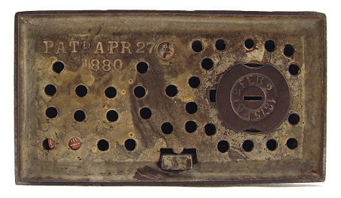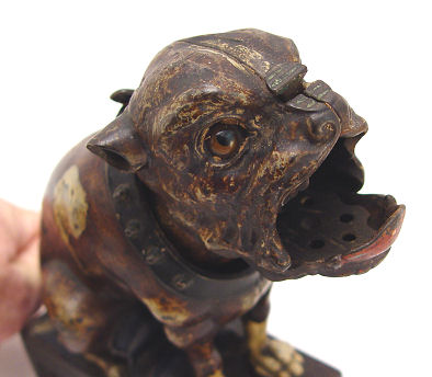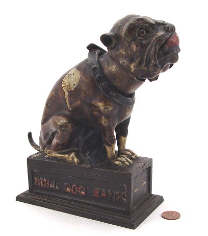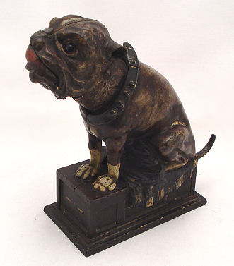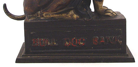 J&E STEVENS CAST IRON MECHANICAL BULLDOG BANK: Ca. 1880. Rest a penny on his nose, pull his tail and the jaw opens to catch the coin. Original paint and glass eyes. 7 1/2''h. The rectangular base is 5 1/2'' x 3''. In good working order.