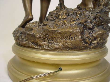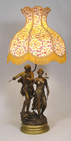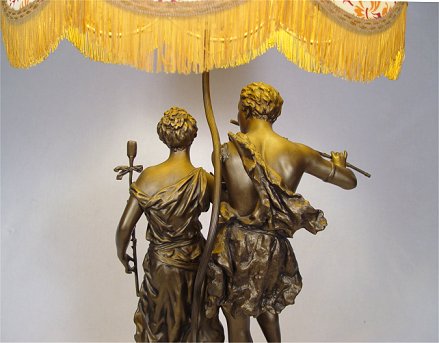LARGE BRONZED SPELTER FRENCH FIGURAL LAMP: Two figures, after Rancoulet, the statue is 21''h, lamp with fringed floral shade is 43''h. Later bronzed finish.