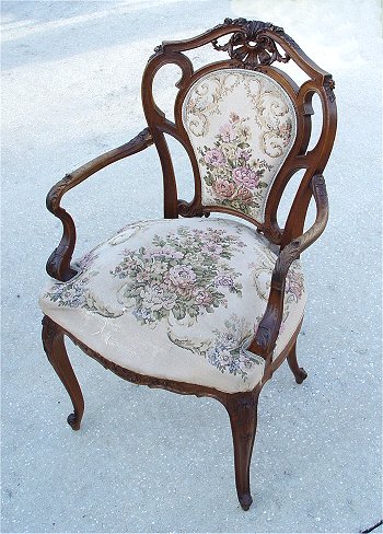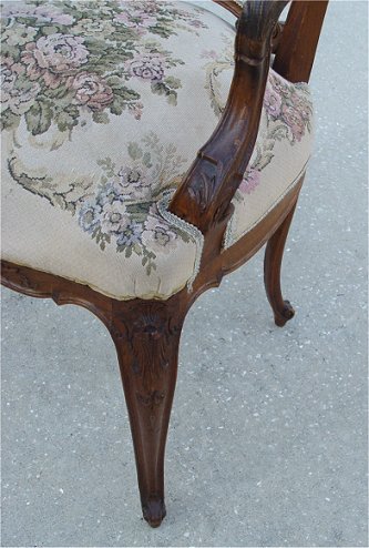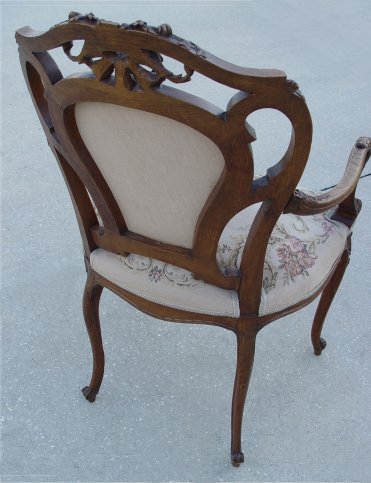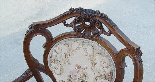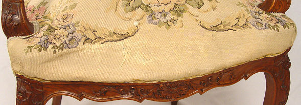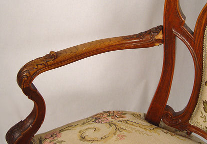LOUIS XV STYLE CARVED AND UPHOLSTERED OPEN ARM CHAIR: French, circa 1910 - 1920, with a strong Art Nouveau influence, the pierce carved back with central upholstered panel and shell carved crestrail, on four cabriole legs with scroll feet, tight upholstered seat. Top of crestrail shell missing, damage to where right arm attaches to back.