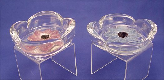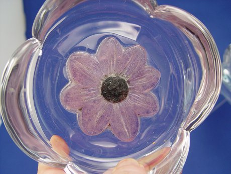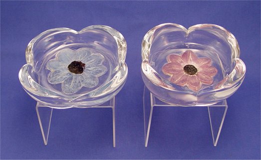 2 DAUM FRENCH CRYSTAL DISHES: Fluted edges, both signed Daum France, each centered by raised daisy, one blue - approx. 6 1/2'' x 1 1/2'', the other purple - 6 1/4'' x 2''. Please note crack in purple dish.