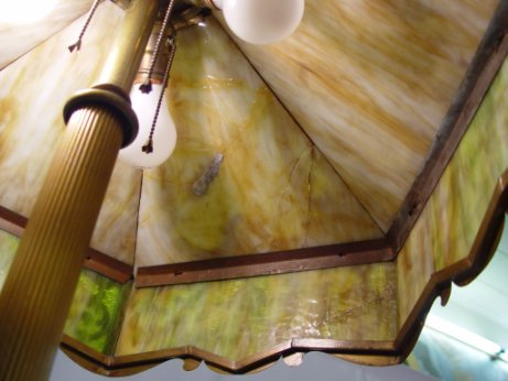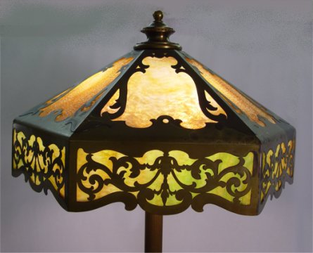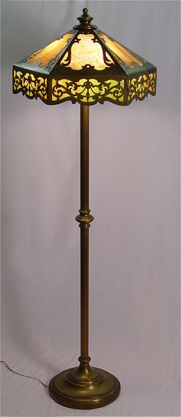 1920'S SLAG GLASS FLOOR LAMP: Conical shade of brass filagree brass and slag glass. 70''h. shade is 23 1/2''h.