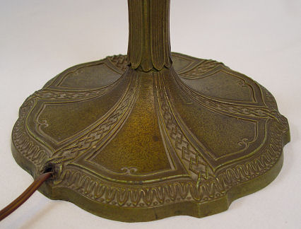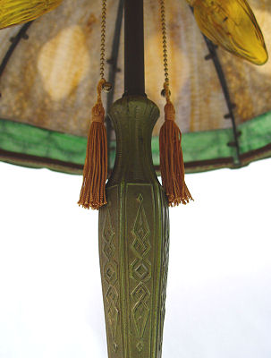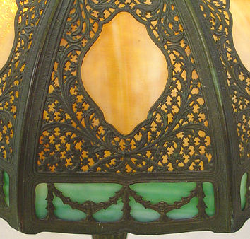 VINTAGE 1920'S SLAG GLASS TABLE LAMP: Domed shade of 8 panels, filagree metal over caramel and green glass. Green patinated base, 2 pull chain sockets. 15''h. 22'' dia.