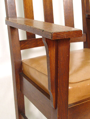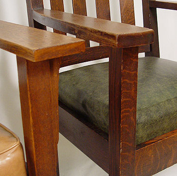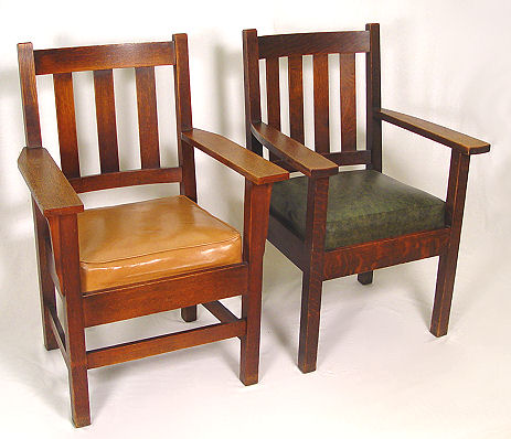 2 MISSION ARTS AND CRAFTS OAK OPEN ARM CHAIRS: American, circa 1900 - 1920. One having three vertical slat back, plank arms, inset slip spring seat, appears to have original finish. 39 1/2'' h. The second chair has four vertical slats, spring seat, 38 1/2''h. 26 1/4''w.
