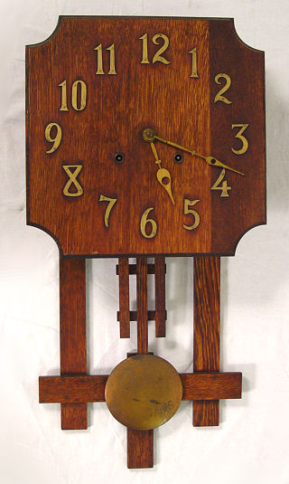 MISSION ARTS & CRAFTS OAK WALL CLOCK: National Clock Manufacture & Co. Key and pendulum included. The case is 26''h. x 13'' x 4 1/2''.