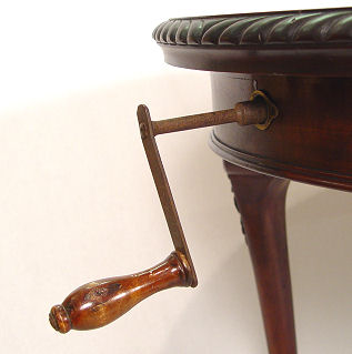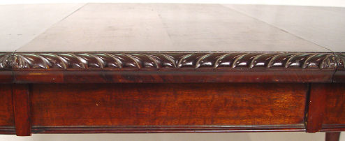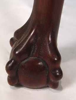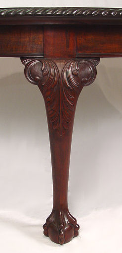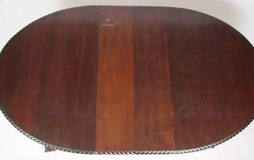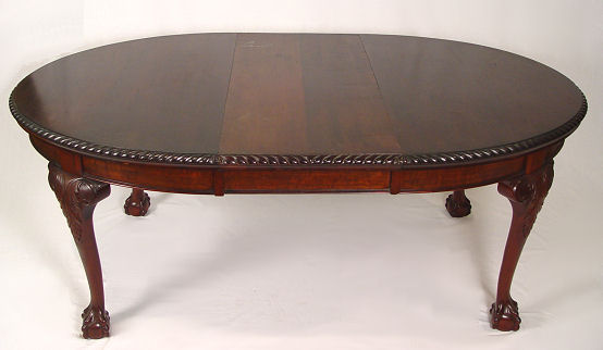 OVAL MAHOGANY BALL AND CLAW FOOT DINING TABLE: Gadroon carved rim, crank mechanism to allow expansion for the leaf (included). 28'' h, 52 1/2'' l x 41 1/2'' w.