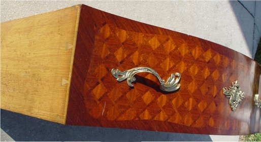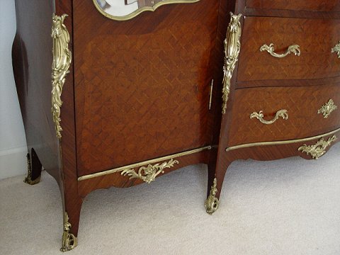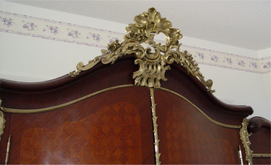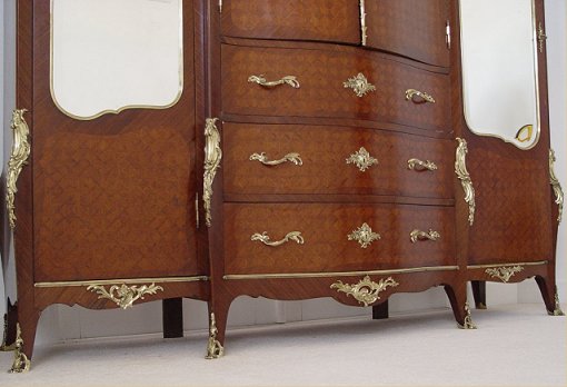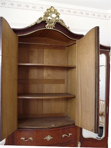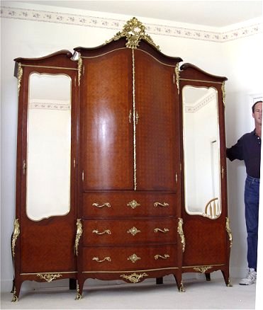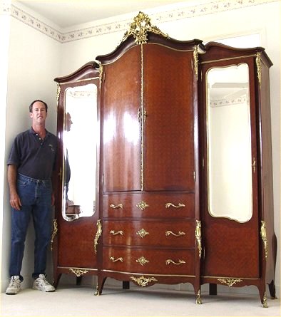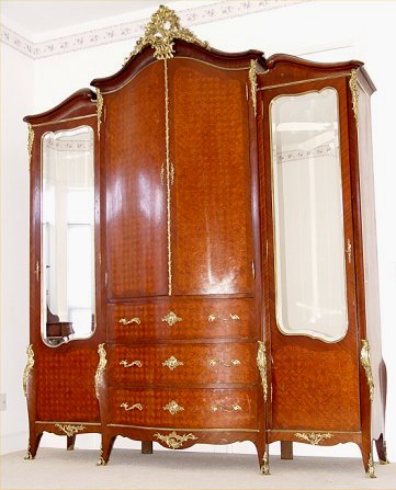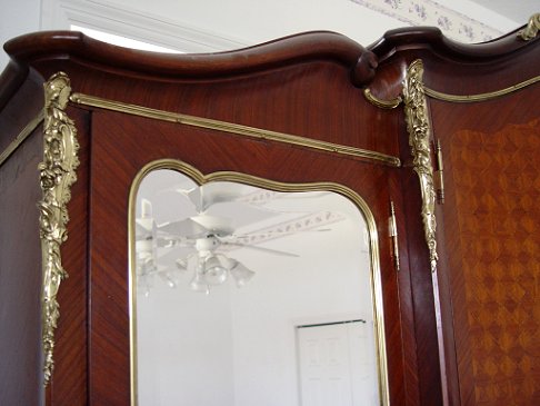 JAS SHOOLBRED & CO 19TH C FRENCH ARMOIRE: A most elegant armoire, parquetry inlay on the door and drawer fronts. Ormolu pediment mounts. Side doors with beveled mirror. Interior shelves. 104''h., 91''w., 24''d.