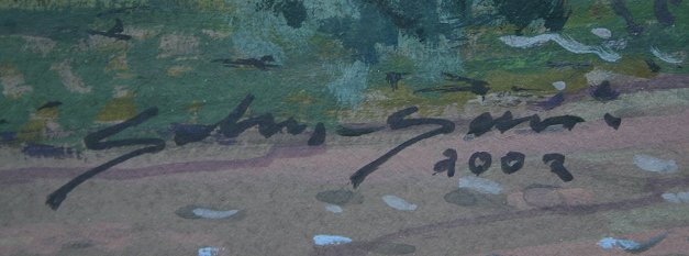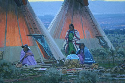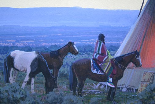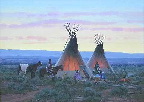 CONTEMPORARY PAINTING OF AN AMERICAN INDIAN ENCAMPMENT: Gouache, 13 1/2 x 19'', SLL illegibly and dated 2002, custom frame and mat, 25'' x 30.