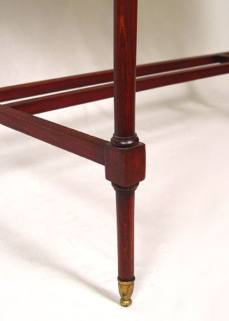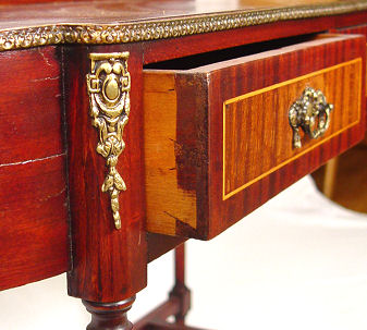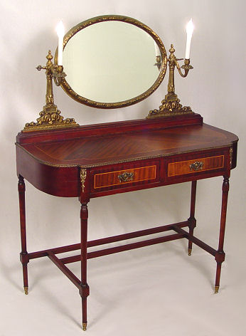 FRENCH ORMOLU LADIES DRESSING TABLE: Oval ormolu framed mirror swings between electric side lamps, banded veneers, 2 drawers. 51 3/4'' x 40'' x 18''.
