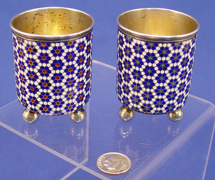 TWO RUSSIAN SILVER ENAMEL BEAKERS FOR TIFFANY & CO.: Bears the makers mark for Gustav Klingert, Moscow, 1887, silver content 84, Made for Tiffany & Co. Each is inscribed on the base, one is for Marguerite, the other for Elliot. Mosaic design, ball feet. 2 1/4''h. 1 3/4'' dia. Approx. 112 grams. 3.6 oz.