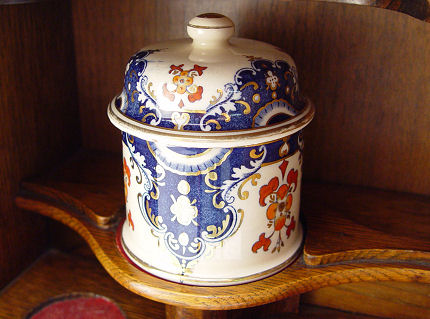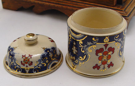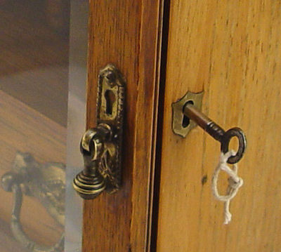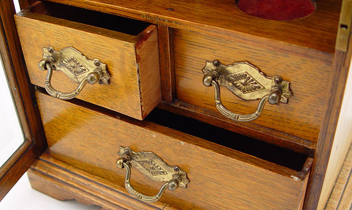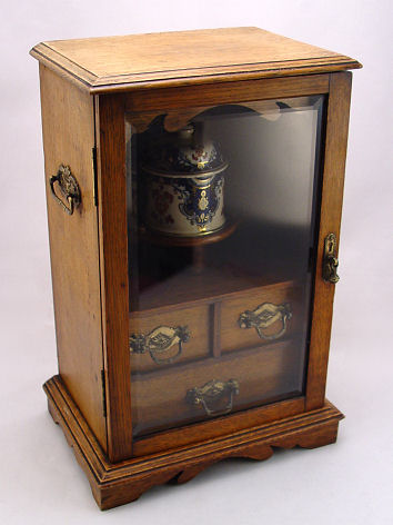 AN ENGLISH 19TH C OAK TABLETOP SMOKING CABINET: Behind the beveled glass door is a flow blue tobacco jar and three drawers with original brass pulls. Brass carrying handles on the exterior. 16 1/2''h. x 11'' x 8''.
