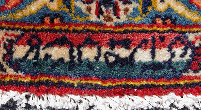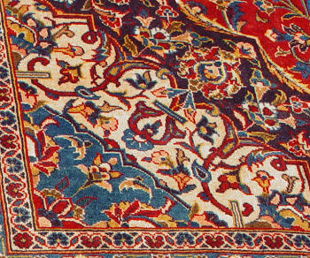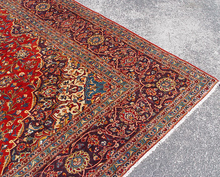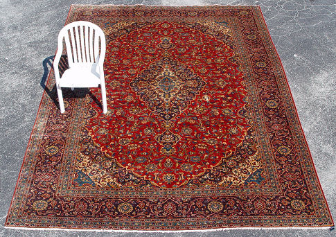 A SIGNED SEMI-ANTIQUE HAND TIED ORIENTAL CARPET: Approx. 13'7'' x 10'3'', red ground, medallion center.