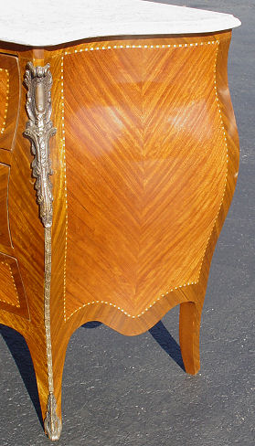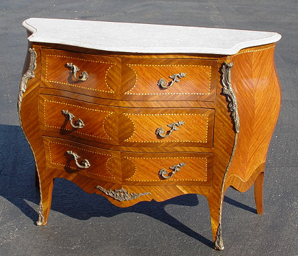 LOUIS XV STYLE MARBLE TOP BOMBE COMMODE: 20th century. Three drawers with scroll brass pulls, string inlay and ormolu bronze mounts. Having a conforming white marble top. 36''h. x 48'' x 22''.