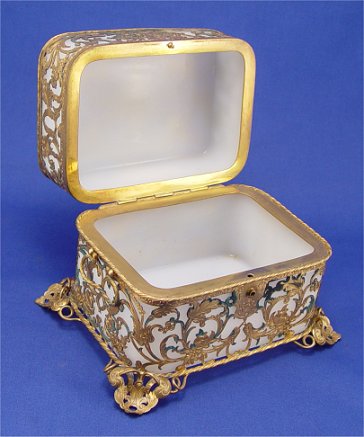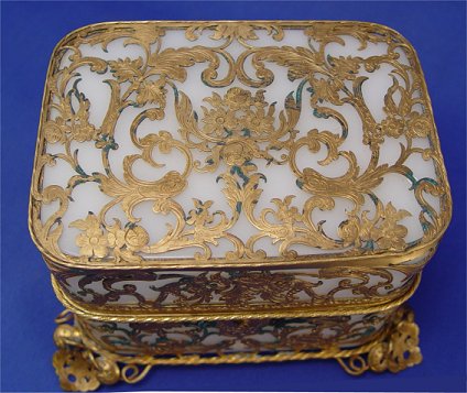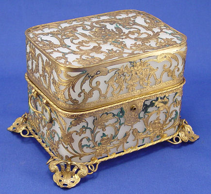 FRENCH OPALINE GLASS JEWEL CASKET: Encased in rose and swirl motif brass filagree, scrolled feet, hinged top. 5''hx 6'' x 4 1/2''.