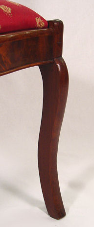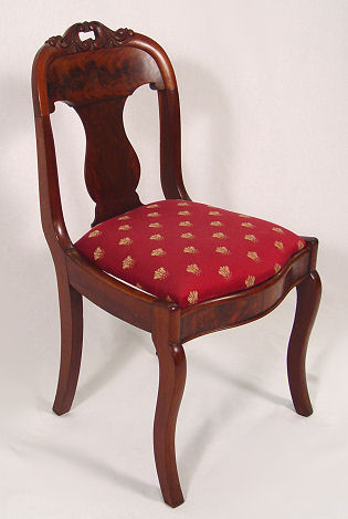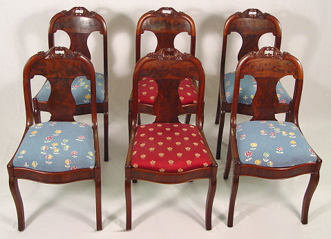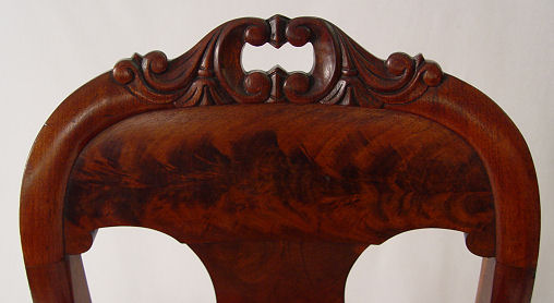 SET OF 6 EMPIRE FLAME GRAIN MAHOGANY SIDE CHAIRS: Arched and carved crests on richly grained mahogany side chairs. 33''h. x 18''w, seat height is 17 1/2''h.