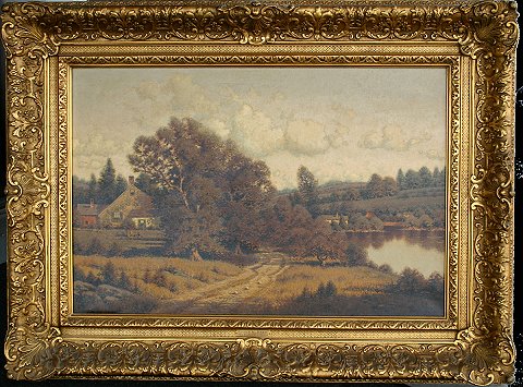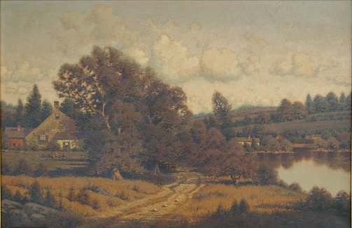 DREW, George W., (American, 1875-1968): New England Landscape, O/C, 24'' x 36'', SLR, original gilded gesso frame with wear and repair, 36'' x 48'', an attractive presentation. Est. $2000/4000**