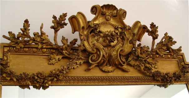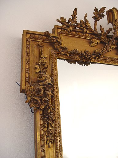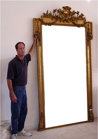 COLOSSAL 19TH C FRENCH LOUIS XVI STYLE CARVED PARLOR MIRROR: Giltwood and gesso, ornate 9'1''h x 5'9 3/4''w x 8''d. overall.