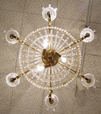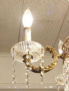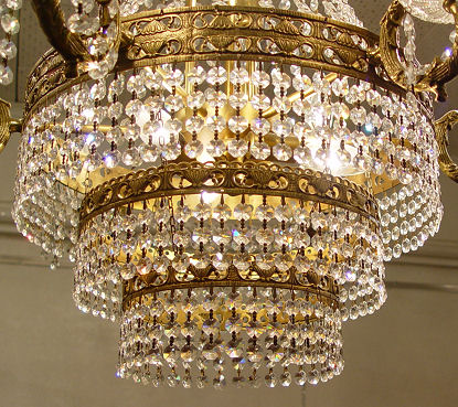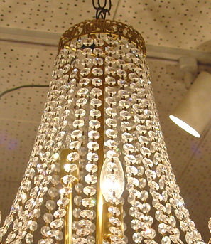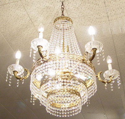 CRYSTAL CHANDELIER: 6 light chandelier in a draped effect, three tiers of prism chains. Approx. 26''l.