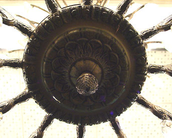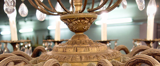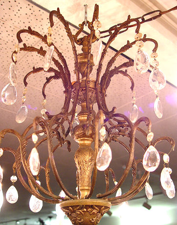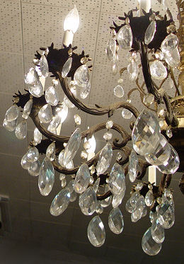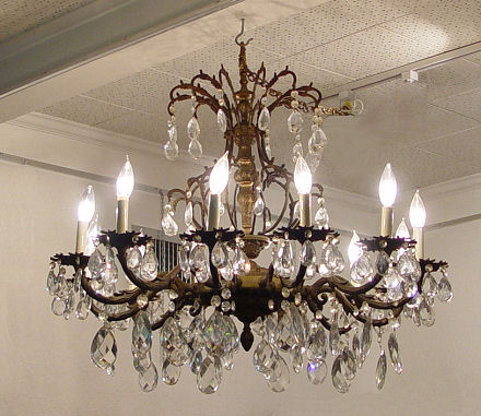12 LIGHT CHANDELIER: Gilt metal frame dripping with faceted crystal prisms, the largest being 4'' tear shaped. 24'' h., approx. 28'' dia.