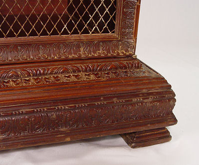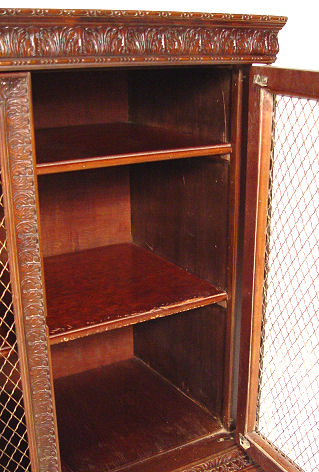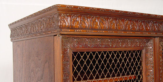 CARVED MAHOGANY LIBRARY CABINET WITH FRENCH WIRE DOORS: Two door bookcase cabinet. Restoration label verso. 37 1/2''h. x 32'' x 18 1/4''.