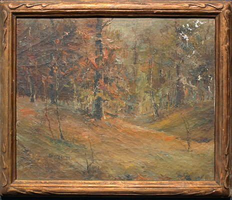IMPRESSIONIST FOREST LANDSCAPE SIGNED: O/C, 14'' x 17'', SLL Nichols and dated '25, period worn frame, 17'' x 20''. Est. $300/500**