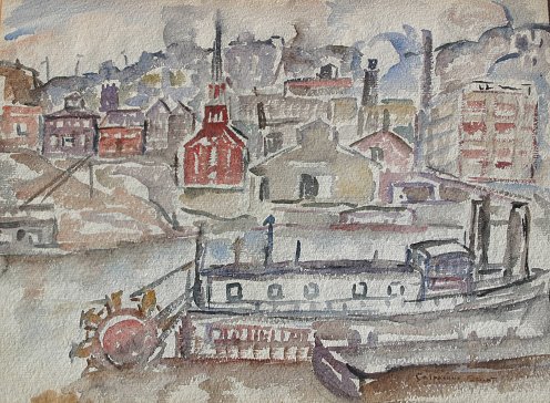 GRANT, Catherine H., (American, 1857-1954): ''Ohio Riverboat'', Pittsburgh, W/C, 14 1/4'' x 19'', SLR, titled verso, worn white frame, 24'' x 29''. Widely exhibited, PAFA, NAWA, etc. Est. $400/600**