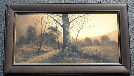 PASTEL LANDSCAPE OF COTTAGE ROAD CIRCA 1900: Signed LL Prossert?, worn period frame, 16 1/2'' x 28 1/2'' overall.