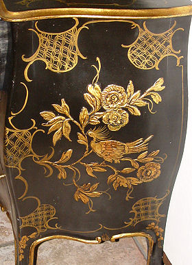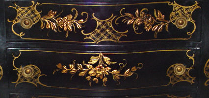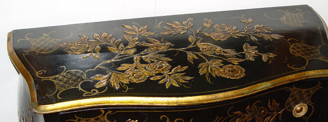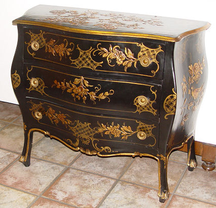 BLACK LACQUER GOLD CHINOISERIE PAINTED COMMODE: Three drawer Bombay stand, heavy hand painted gold decoration, late 20Tth C. 32 1/2''h x 38''w. x 16''.