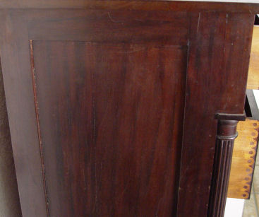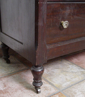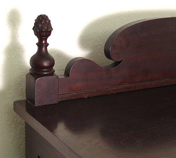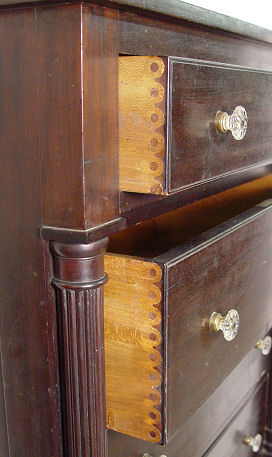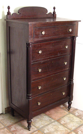 19th C MAHOGANY TALL CHEST: 5 drawers with overhanging top drawer, reeded stiles, glass knob pulls, shaped backsplash. 53''h. x 19 1/2''.